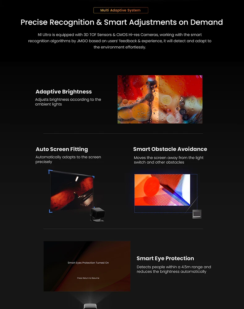 3. Auto Keystone, Auto Focus, Eye Care, Auto Avoid Obstacles, etc. are all auxiliary functions of the projector. If the image is not accurate after auto adjustment, please manually adjust it for use. Thank you!